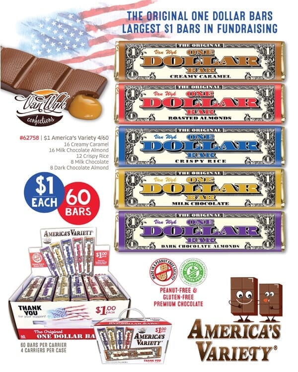America’s Variety One Dollar Bars are a delicious addition to any fundraising campaign. Their cheap price, numerous flavors, and sweet taste will make them a favorite among your customers!