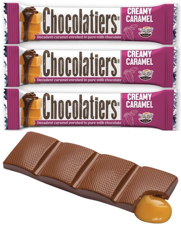 The new Chocolatiers straight pack features the top flavor creamy caramel. They are 100% certified peanut-free chocolate. Minimum order is only 1 case and you always get free shipping.