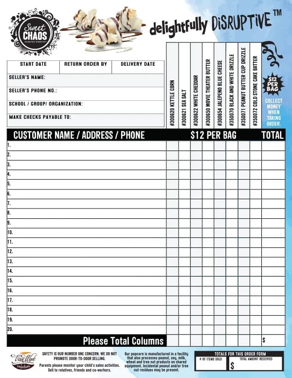 1) Order Your Free Sweet Chaos Popcorn Order-Takers. We will mail out your popcorn order-takers, and create your group's custom online store. We will email you a link so you can share the store with your group members and parents.