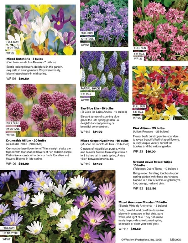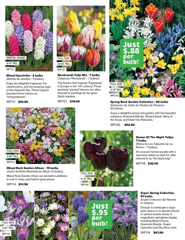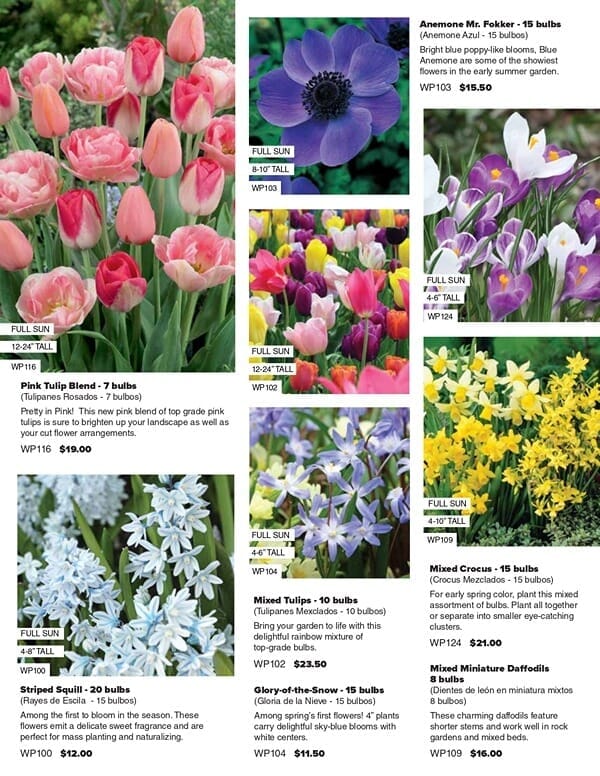 Wide Variety of Bulbs to Choose From. You and your supporters can choose from 18 items whose different prices are listed in the colorful 4-page brochure: Mixed Crocus, Mixed Tulips, Anemone Mr. Fokker, Glory-of-the-Snow, Cool Blue Collection, Mixed Daffodils, Paperwhite Narcissus, Mixed Hyacinths, Allium Giant, Mixed Rock Garden Allium, Pink Tulip Blend, Super Spring Collection, Spring Rock Garden Collection, Rembrandt Tulip Mix, Ground Cover Mixed Tulips, Striped Squill, Queen Of The Night Tulips.